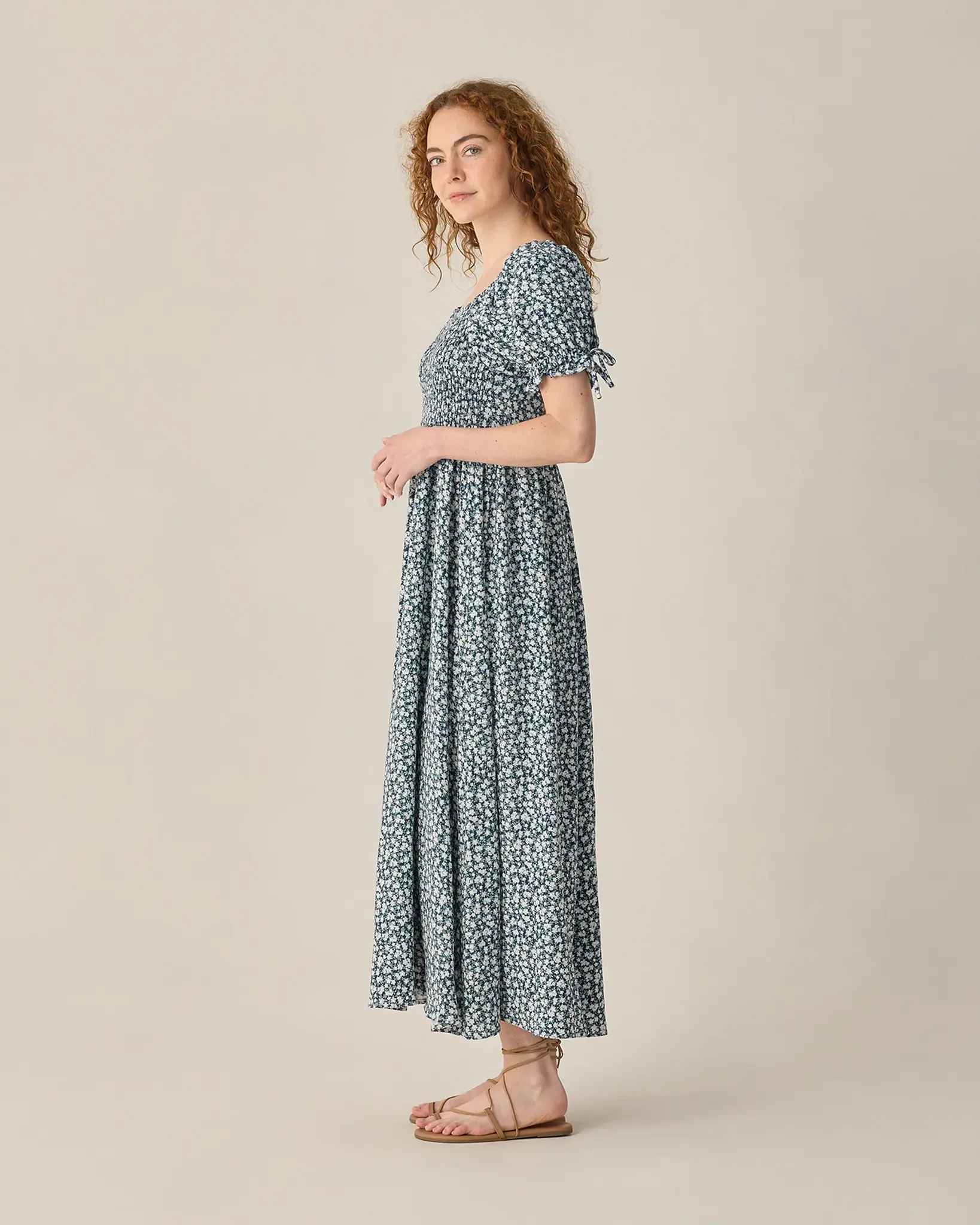• Our Dallas Dress features a smocked bodice, puff sleeves with fixed ties, and a full skirt.