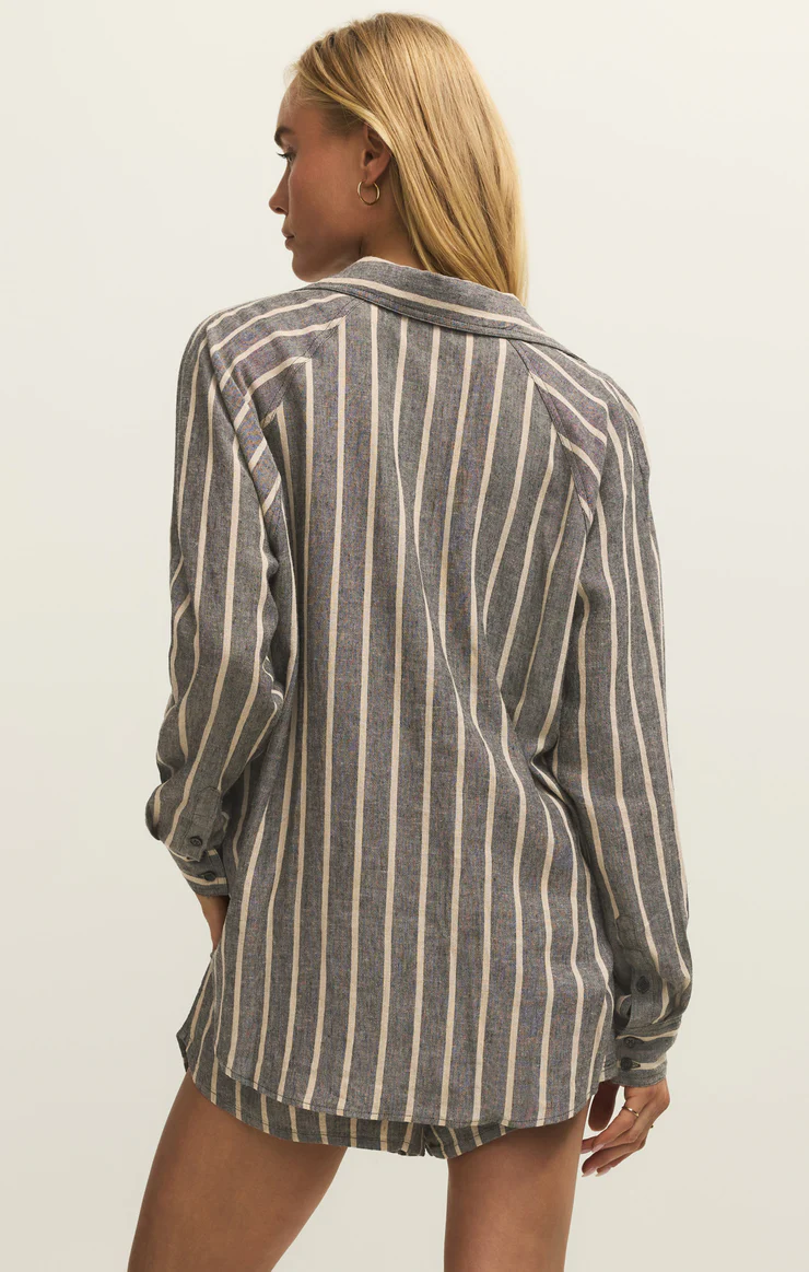 Relaxed fitTextured Linen Rayon: 55% Linen 45% RayonCollaredLong sleeveCurved hemlineButton frontChest pocketLightweightHeavy soft washMachine wash cold, Hang to dry, Cool iron if needed