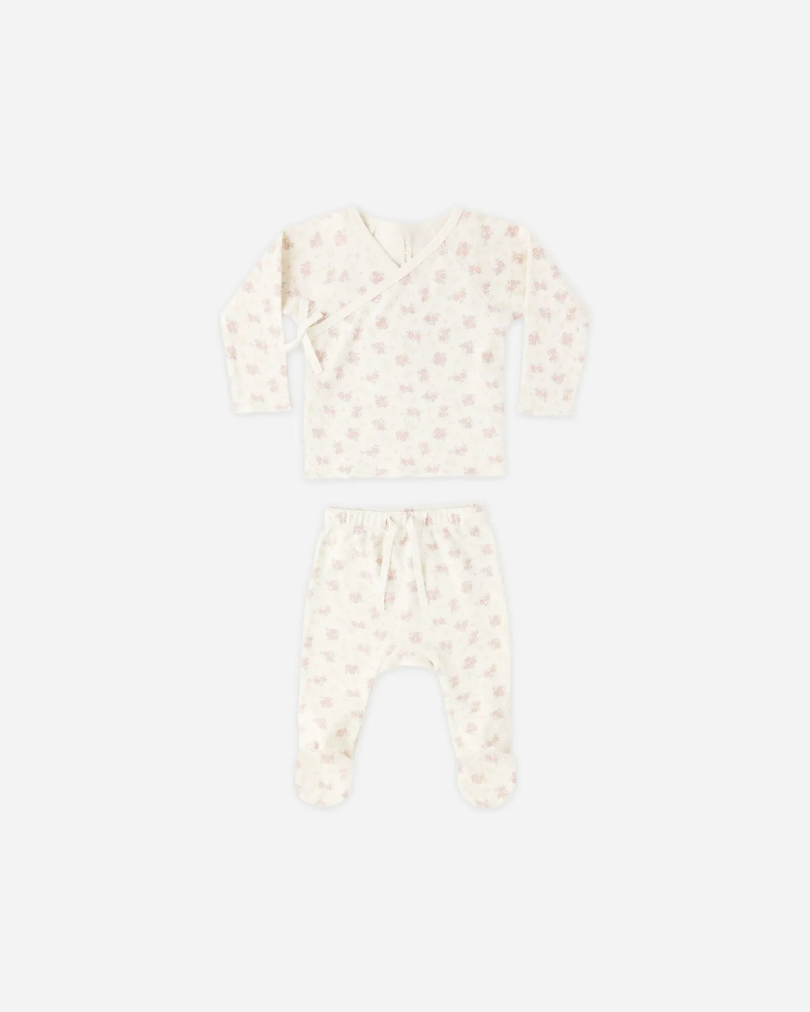 Bring home baby in this sweet set. Featuring our long sleeve wrap top with inside snaps and side tie, and matching drawstring footed pants.